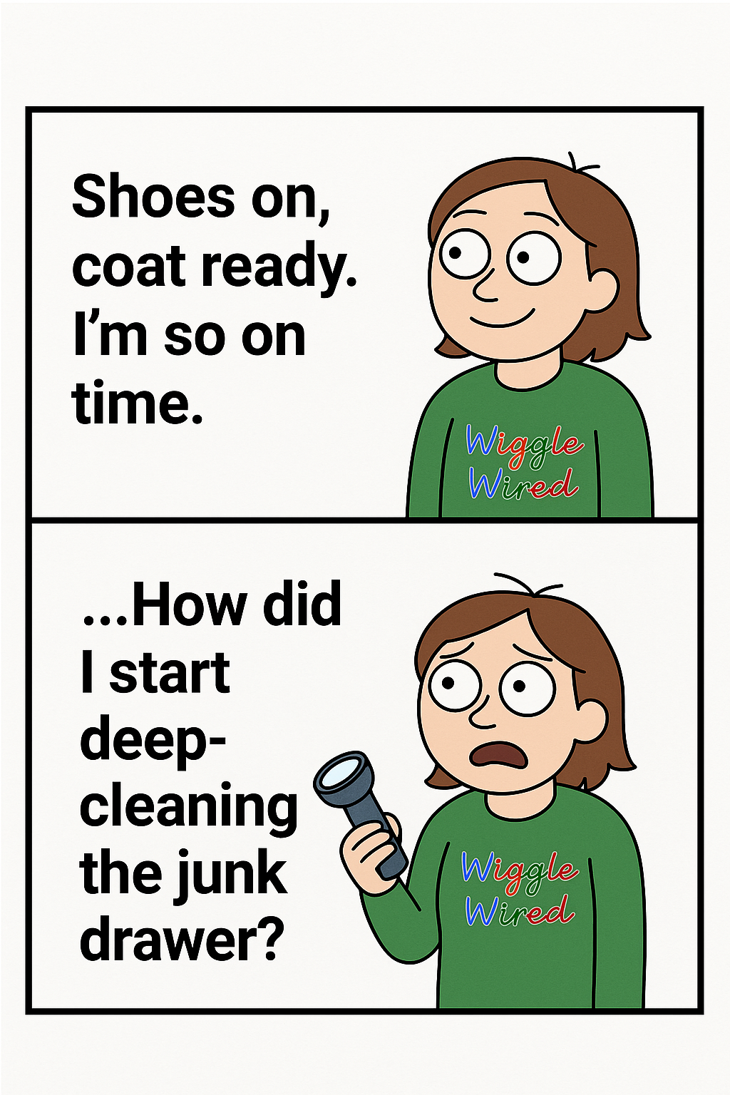 Fifteen minutes later, I’m knee-deep in a full reorganization of the junk drawer, dust bunnies multiplying around me, the clock mocking me from the corner of my eye.
